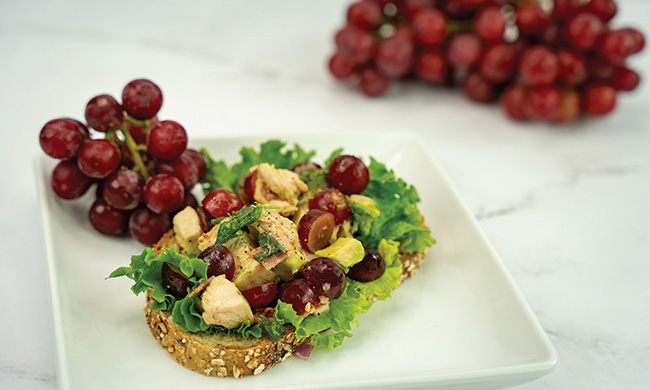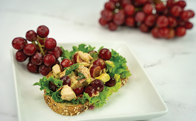 A simple, fresh salad offers the best of both worlds: easy prep and a light bite everyone can enjoy together. Fresh, delicious Grapes from California shine in this Grape and Chicken Salad with Lemon-Balsamic Vinaigrette, perfect for serving on its own or pairing with sandwiches. The crisp, juicy grapes add a touch of natural sweetness to complement tender chicken, creamy avocado and smoky bacon.